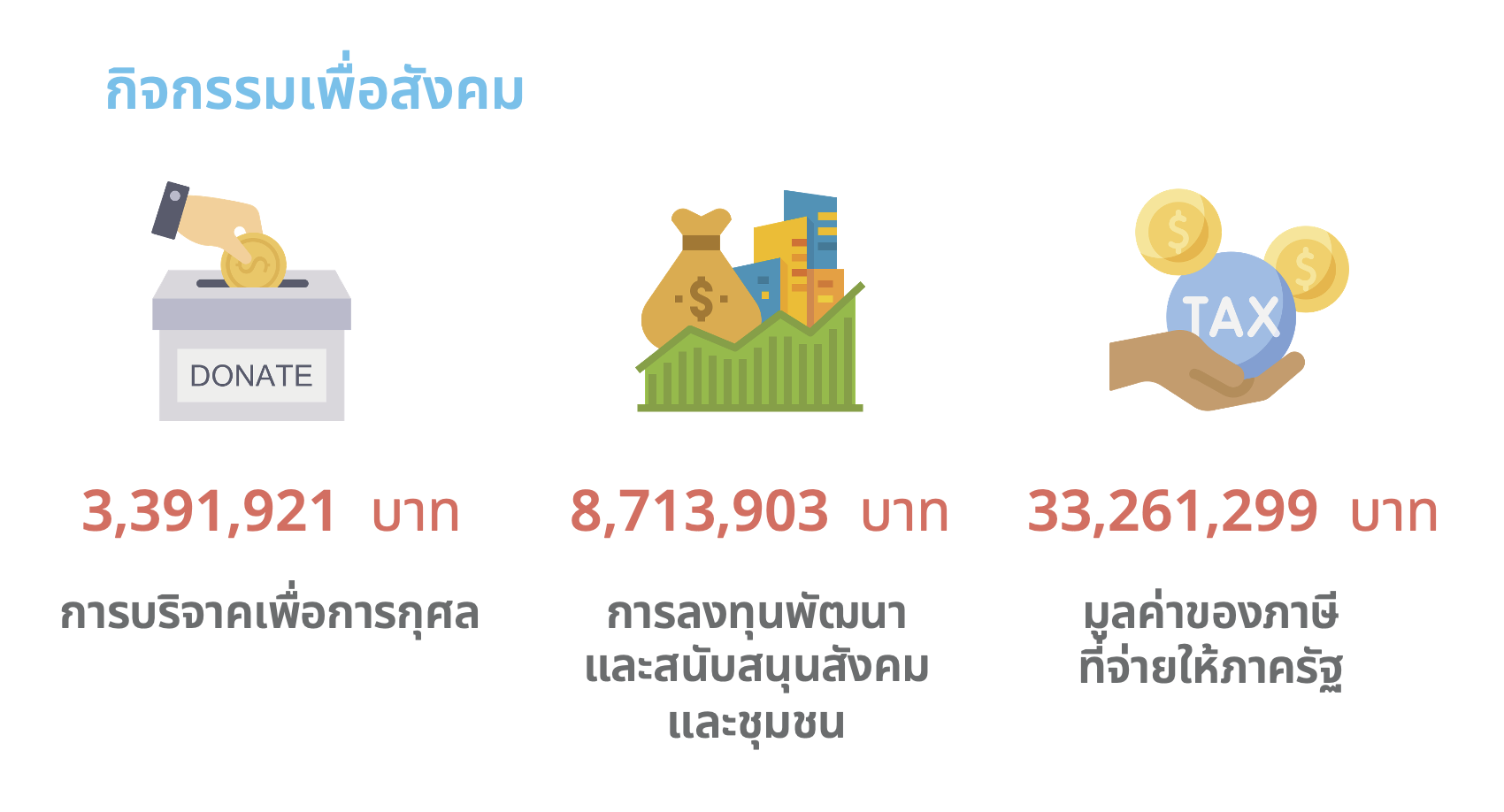 บริษัทเชื่อมั่นว่าธุรกิจจะเติบโตอย่างยั่งยืนได้ ชุมชนและสังคมจะต้องพัฒนาไปพร้อมๆ กัน เราจึงเล็งเห็นถึงความสำคัญในการสนับสนุนกิจกรรมเพื่อสังคมและชุมชน และด้วยตระหนักถึงบทบาทหน้าที่ของพลเมืองที่ดีและหลักปรัชญา 3 ประโยชน์สู่ความยั่งยืนของบริษัท (ต่อประเทศ ประชาชน และบริษัท)