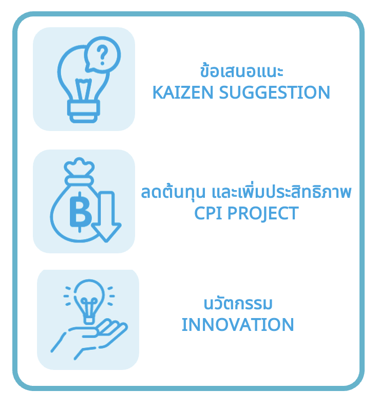 จากเป้าหมายการนำค่านิยมสู่การปฏิบัติผ่านการทำโครงการพอใจวันเดียว โดยการริเริ่ม ปรับปรุุงสร้างสรรค์งานของตนเองซึ่งทำให้พนักงานได้มีทัศนคติที่ยอมรับการเปลี่ยนแปลง พอใจในความสำเร็จในปัจจุุบันเพียงวันเดียว พร้อมทั้งคิดค้นหาวิธีการทำงานในปัจจุบันให้ดีขึ้นอยู่เสมอ ด้วยการสร้างสรรค์ สิ่งใหม่ ทำเรื่องยากให้เป็นเรื่องง่าย หรือทำเร็วและมีคุณภาพ เพื่่อสร้างประโยชน์ต่อตนเอง บริษัทหรือสังคมภายนอก ทั้งนี้ทางกลุ่มธุรกิจฯ ได้ส่งเสริมให้พนักงานคิดค้นโครงการใน 3 รูปแบบ ดังนี้