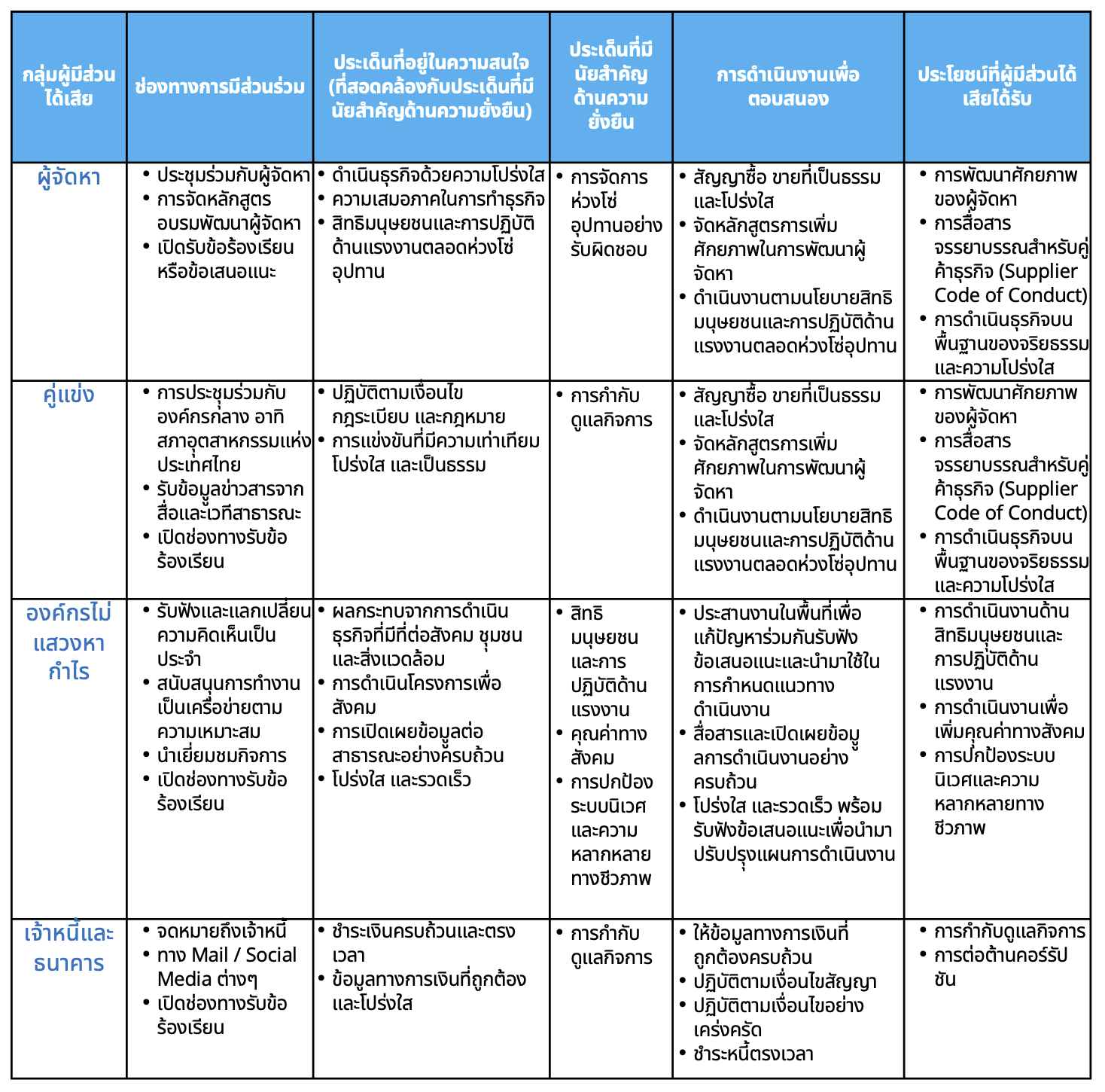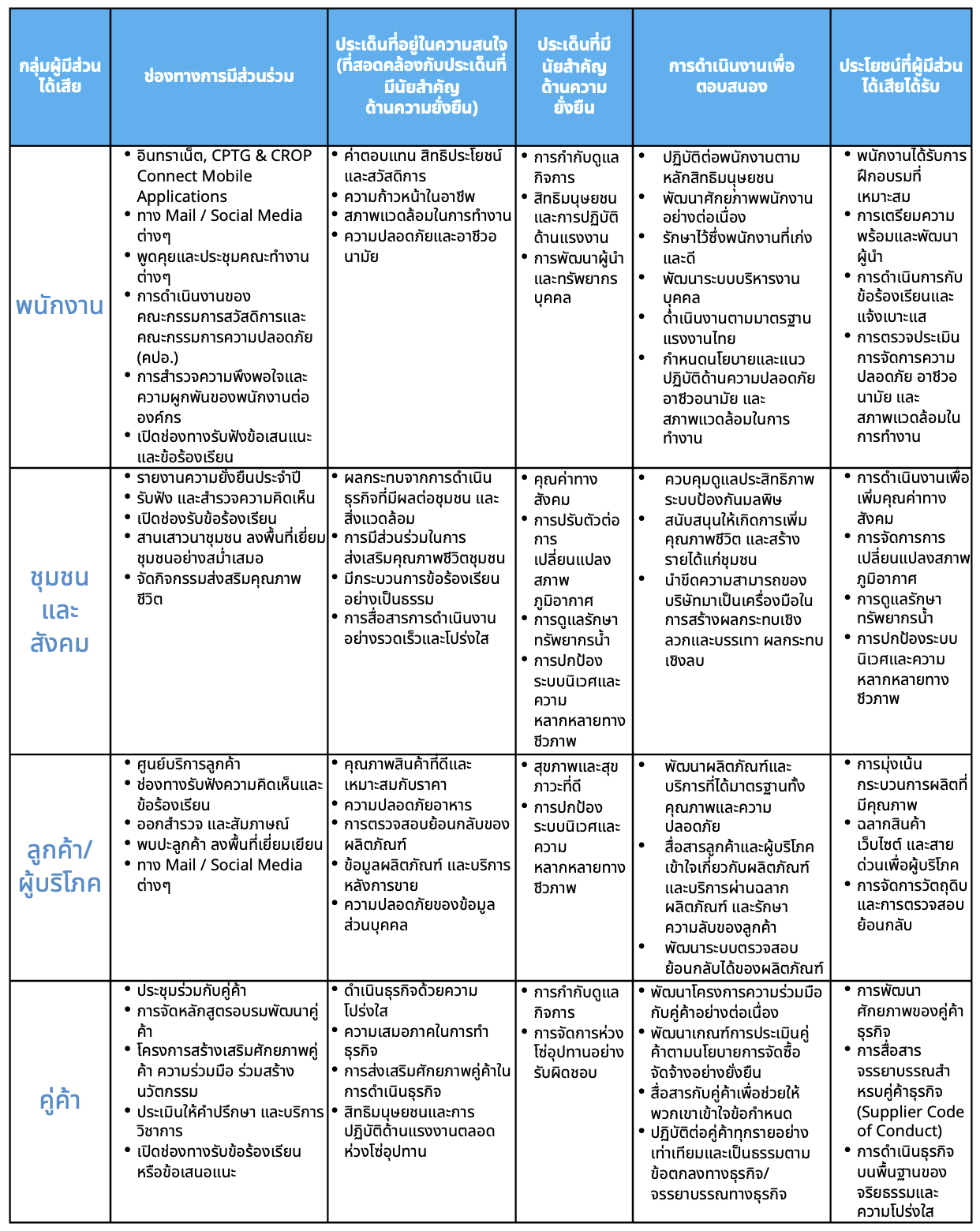 ด้วยความมุ่งมั่นที่จะรักษาสมดุลระหว่างการสร้างคุณค่า มูลค่าและความสัมพันธ์ที่ดีกับผู้มีส่วนได้ส่วนเสียทุกกลุ่มธุรกิจ ข้าว ขนส่งและบริการ ได้ดำเนินการสื่อสาร รวมถึงการสำรวจการรับรู้ของผู้มีส่วนได้เสียที่ครอบคลุมในทุกภูมิภาคทั่วโลกตามฐานการผลิตและการดำเนินธุรกิจของพื้นที่ที่เครือฯเข้าไปดำเนินงาน