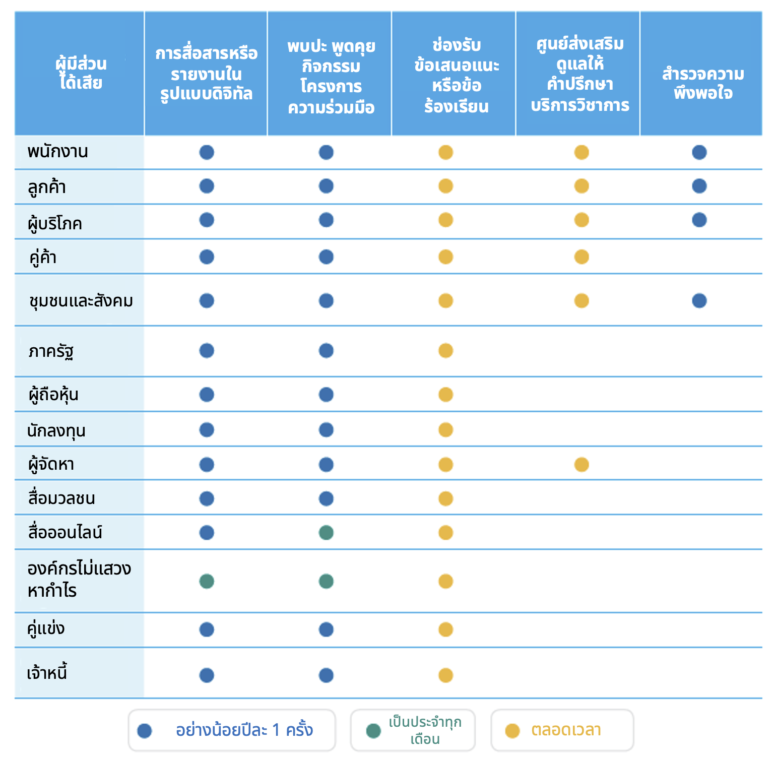 - เพื่อประเมินคุณภาพของการมีส่วนร่วมระหว่างบริษัท กับผู้มีส่วนได้เสีย