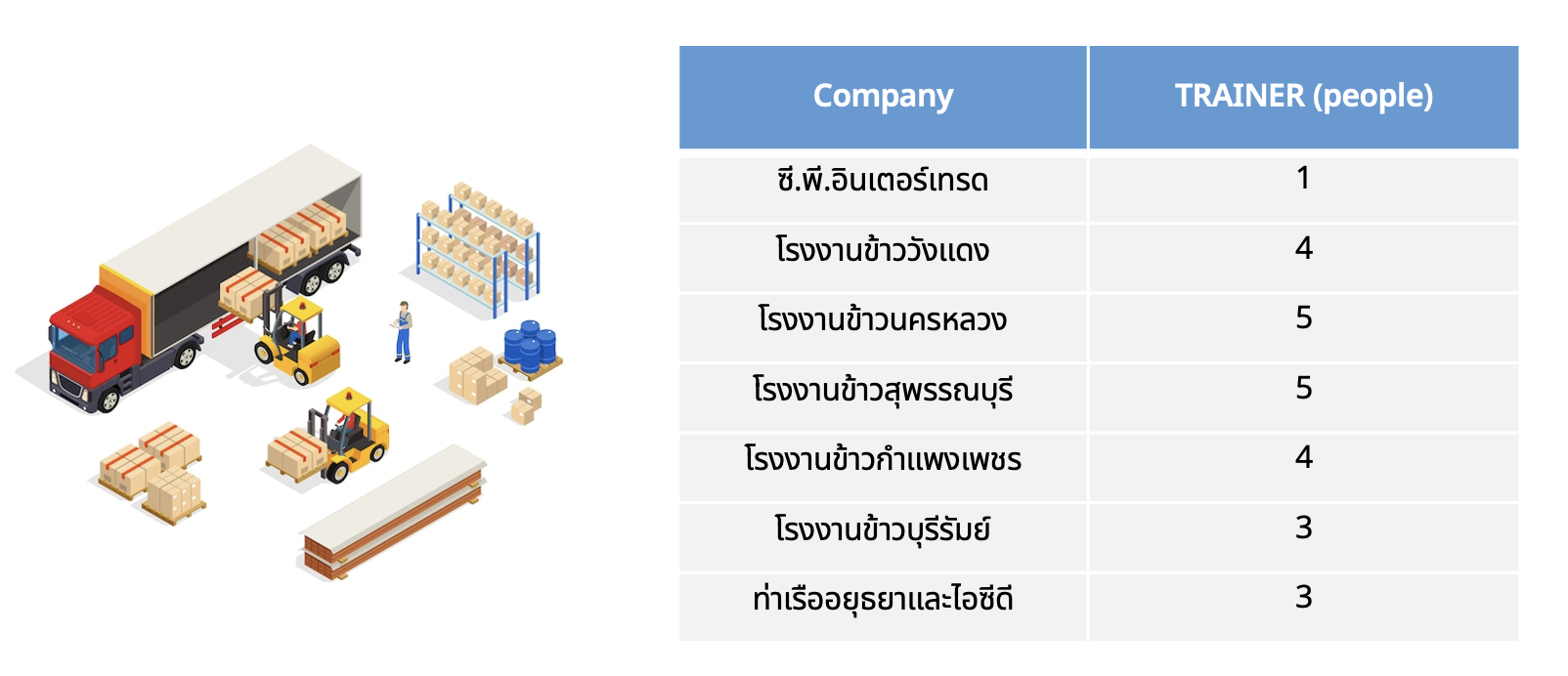 ด้วยบริษัทฯ ได้ประกาศแต่งตั้งผู้ทำหน้าที่ทดสอบปฏิบัติการขับขี่รถยกของธุรกิจข้าว ขนส่งและบริการ เพื่อทำหน้าที่ฝึกสอนและทดสอบพนักงานที่รับผิดชอบใช้งานรถยกประจำแต่ละโรงงาน ซึ่งจำเป็นต้องผ่านการฝึกอบรม และทดสอบตามมาตรฐานของเครือเจริญโภคภัณฑ์ แต่ด้วยตำแหน่งงานดังกล่าวมีการหมุนเวียนผู้ขับขี่บ่อย ทำให้แต่ละโรงงานประสบปัญหารอระยะเวลานานในการส่งพนักงานเข้ารับการฝึกอบรม และสอบตามมาตรฐานของเครือฯ ส่งผลกระทบ ต่อการปฏิบัติงานของโรงงาน จึงได้กำหนดผู้ทำหน้าที่ดังกล่าวข้างต้นขึ้น สำหรับฝึกสอน และทดสอบการขับรถยกของพนักงานประจำแต่ละโรงงาน โดยปฏิบัติตามหลักสูตรมาตรฐานเครือเจริญโภคภัณฑ์