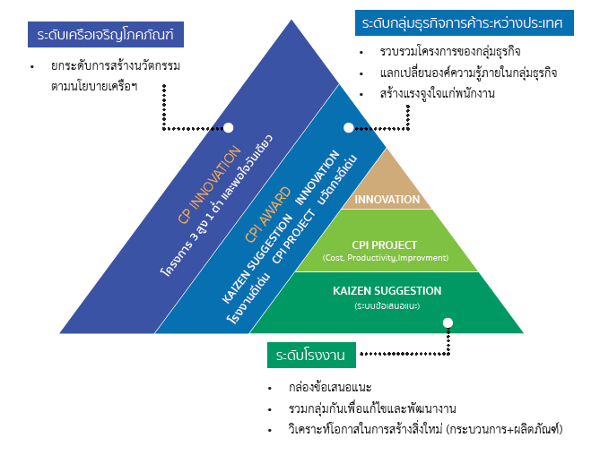 บริษัท ซี.พี. อินเตอร์เทรด จำกัด และบริษัทในธุรกิจข้าว ขนส่งและบริการ เห็นความสำคัญต่อการปลูกฝังและการสร้างทัศนคติที่ดีต่อการสร้างสรรค์สิ่งใหม่ และพัฒนาต่อยอดไปสู่การสร้างนวัตกรรม ครอบคลุมทั้ง 3 ด้าน ได้แก่ เศรษฐกิจ เทคโนโลยี และสังคม ทางบริษัทฯ เริ่มจากการเน้นการดำเนินงานของพนักงานระดับปฏิบัติการ โดยมุ่งเน้นให้พนักงานแก้ปัญหาหน้างานด้วยตนเอง จึงมีการสร้างระบบข้อเสนอแนะ (Kaizen Suggestion) และมีการสร้างแรงจูงใจโดยสร้างเวทีให้พนักงานได้นำเสนอผู้บริหาร เมื่อพนักงานได้มีการพัฒนาและเกิดเป็นวัฒนธรรมในระดับหนึ่งลำดับถัดไปมีเป้าหมายให้พนักงานทำงานร่วมกันจึงมีการเซ็ตการทำงานเป็นทีม โดยใช้แนวคิดของ QCC System ให้พนักงานรวมกลุ่มกัน แก้ไขปัญหาที่ยากขึ้น มีการร่วมกันตัดสินใจระหว่างทีมเพื่อให้เกิดการแก้ไขปัญหาร่วมกัน ผ่านกระบวนการ CPI Project ครอบคลุม เรื่องการเพิ่มประสิทธิภาพ การลดต้นทุน และการปรับปรุงอย่างต่อเนื่อง จากนั้นมุ่งเน้นการร่วมมือกันแบบ Cross Function พัฒนาสู่กระบวนการ Innovation System ส่งเข้า CP INNOVATION ของเครือ ทั้งนี้ในระดับกลุ่มธุรกิจ ได้จัดเวทีให้พนักงานแสดงศักยภาพในการประกวดผลงาน ในงาน CPI Award โดยมีวัตถุประสงค์เพื่อเชิดชูนวัตกรผู้คิดค้นผลงาน และเพื่อแบ่งปันความรู้ และแลกเปลี่ยนประสบการณ์ของพนักงาน ทั้งนี้ผลงานที่มีความโดดเด่นจะได้รับการพัฒนาและยกระดับไปสู่การประกวดนวัตกรรมของเครือเจริญโภคภัณฑ์