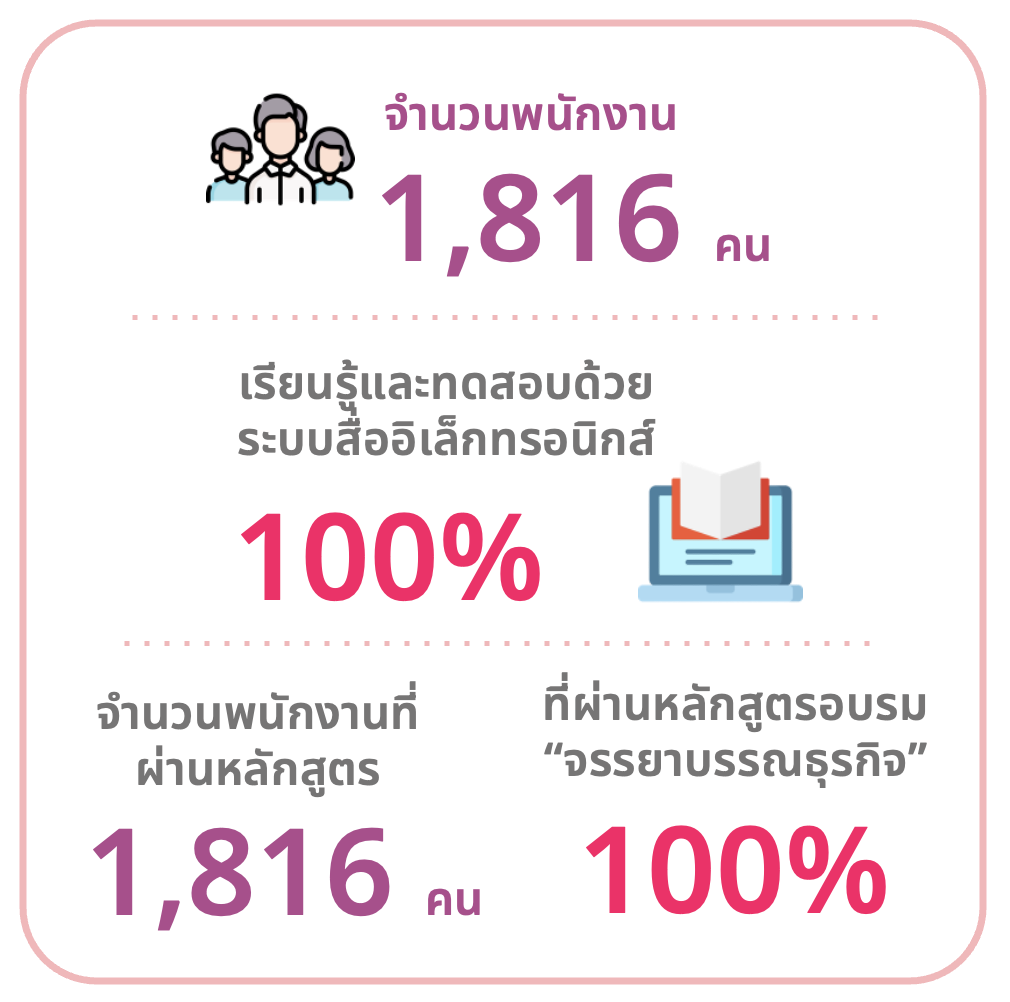 ทางบริษัท ได้จัดทำสื่อการเรียนรู้ และการทดสอบจรรยาบรรณธุรกิจเป็นภาษากัมพูชา เพื่อให้พนักงานได้รับทราบและสื่อสารได้อย่างชัดเจน ซึ่งพนักงานของบริษัททั้งคนไทย และคนกัมพูชา ได้เรียนรู้จรรยาบรรณธุรกิจและผ่านเกณฑ์การทดสอบครบ 100 เปอร์เซ็นต์ นอกจากนั้น กรรมการและผู้บริหารระดับสูงของบริษัทฯ และได้เข้ารับการอบรมในหัวข้อความขัดแย้งทางผลประโยชน์ ทำให้เกิดความตระหนักรู้และเกิดแนวทางการดำเนินงานที่โปร่งใส