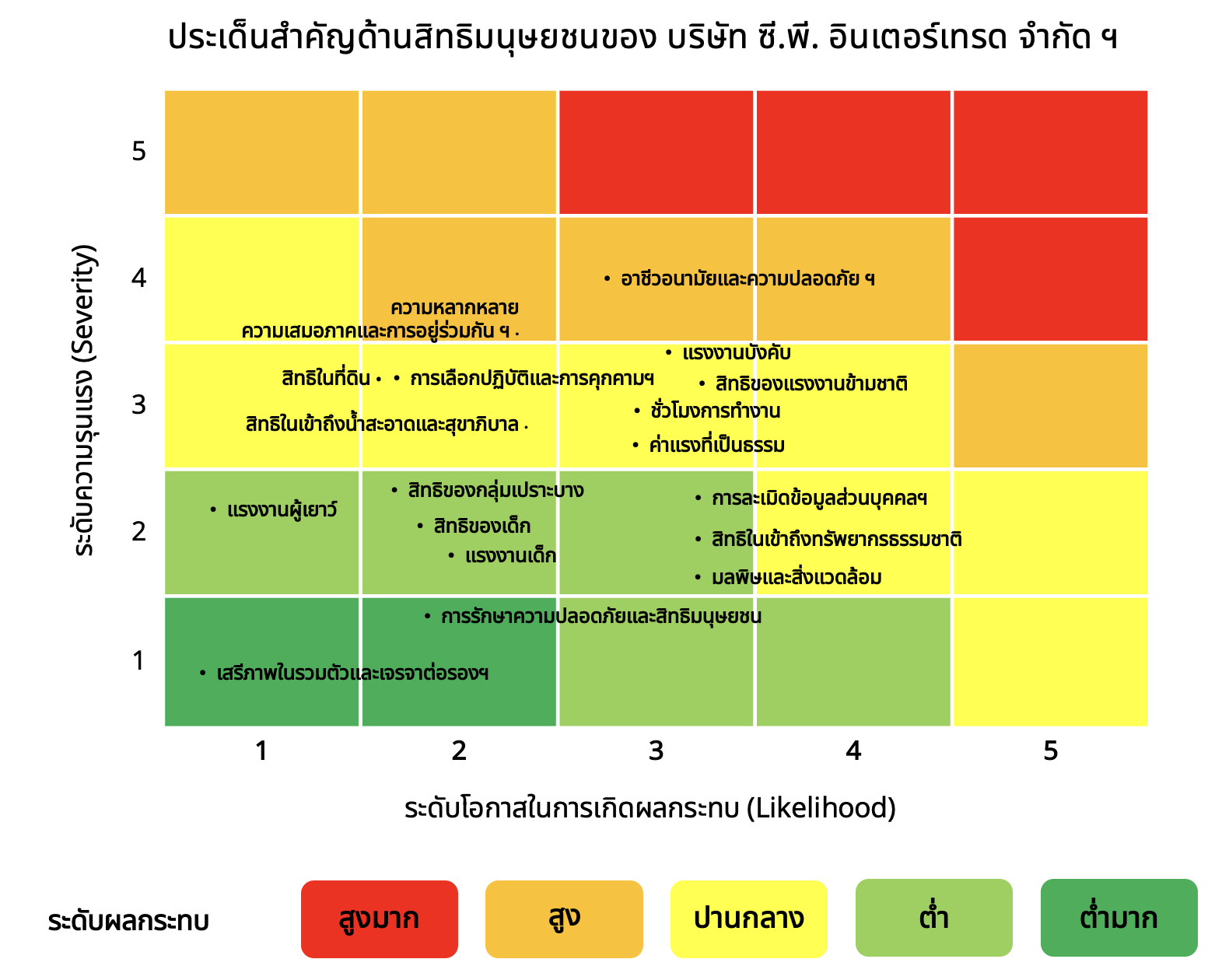 - ความเสี่ยงภาพรวมของธุรกิจข้าว ขนส่งและบริการ กลุ่มผู้มีส่วนได้เสียสำคัญขององค์กรคือเกษตรกร ซึ่งเป็นต้นน้ำของธุรกิจ จึงมีการกำหนดยุทธศาสตร์การสร้างงานและส่งเสริมรายได้ให้แก่เกษตรกร เพื่อนสร้างคุณภาพชีวิตที่ดีขึ้น 100,000 ครัวเรือน ภายในปี 2030 และส่งเสริมการทำเกษตรกรรมที่เป็นมิตรต่อสิ่งแวดล้อม เพื่อนำไปสู่เป้าหมาย Net zero carbon emissions นำไปสู่สร้างความยั่งยืนให้กับสังคมและองค์กรในระยะยาว