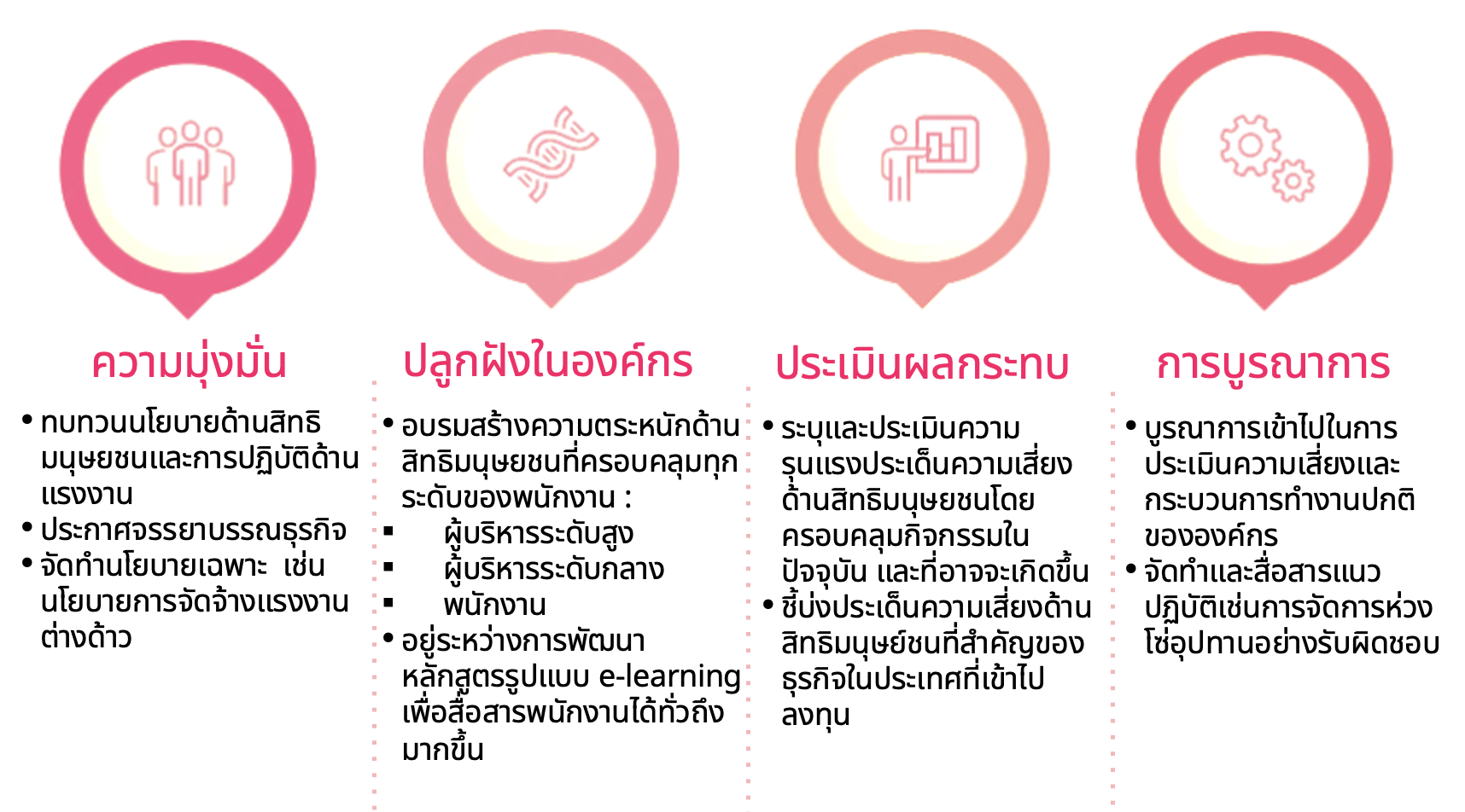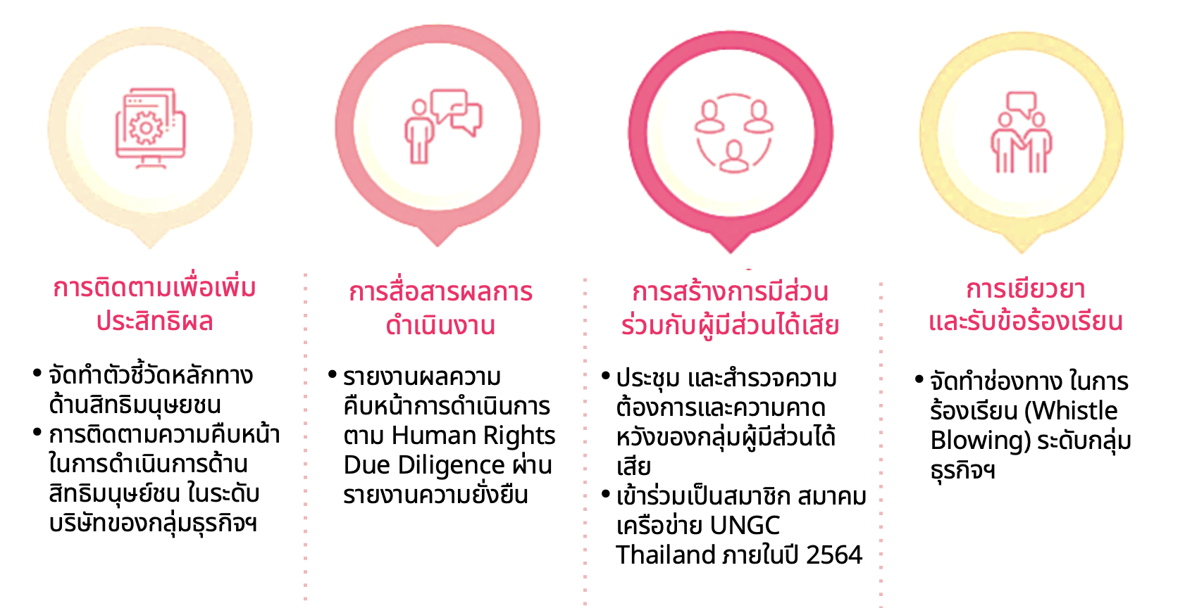 เพื่อให้มั่นใจว่าทุกกลุ่มธุรกิจมีการบริหารจัดการความเสี่ยงและผลกระทบด้านสิทธิมนุษยชนที่อยู่ในขอบเขตความรับผิดชอบของตนอย่างเต็มที่ ในขณะเดียวกันยังมุ่งเน้นการดําเนินการเชิงรุกเพื่อป้องกันผลกระทบเชิงลบที่อาจเกิดขึ้นกับการจ้างแรงงาน โดยมีนโยบายชัดเจนที่จะไม่กระทำหรือสนับสนุนให้มีการใช้แรงงานบังคับในทุกรูปแบบ รวมถึงการใช้แรงงานต่างด้าวอย่างผิดกฎหมาย