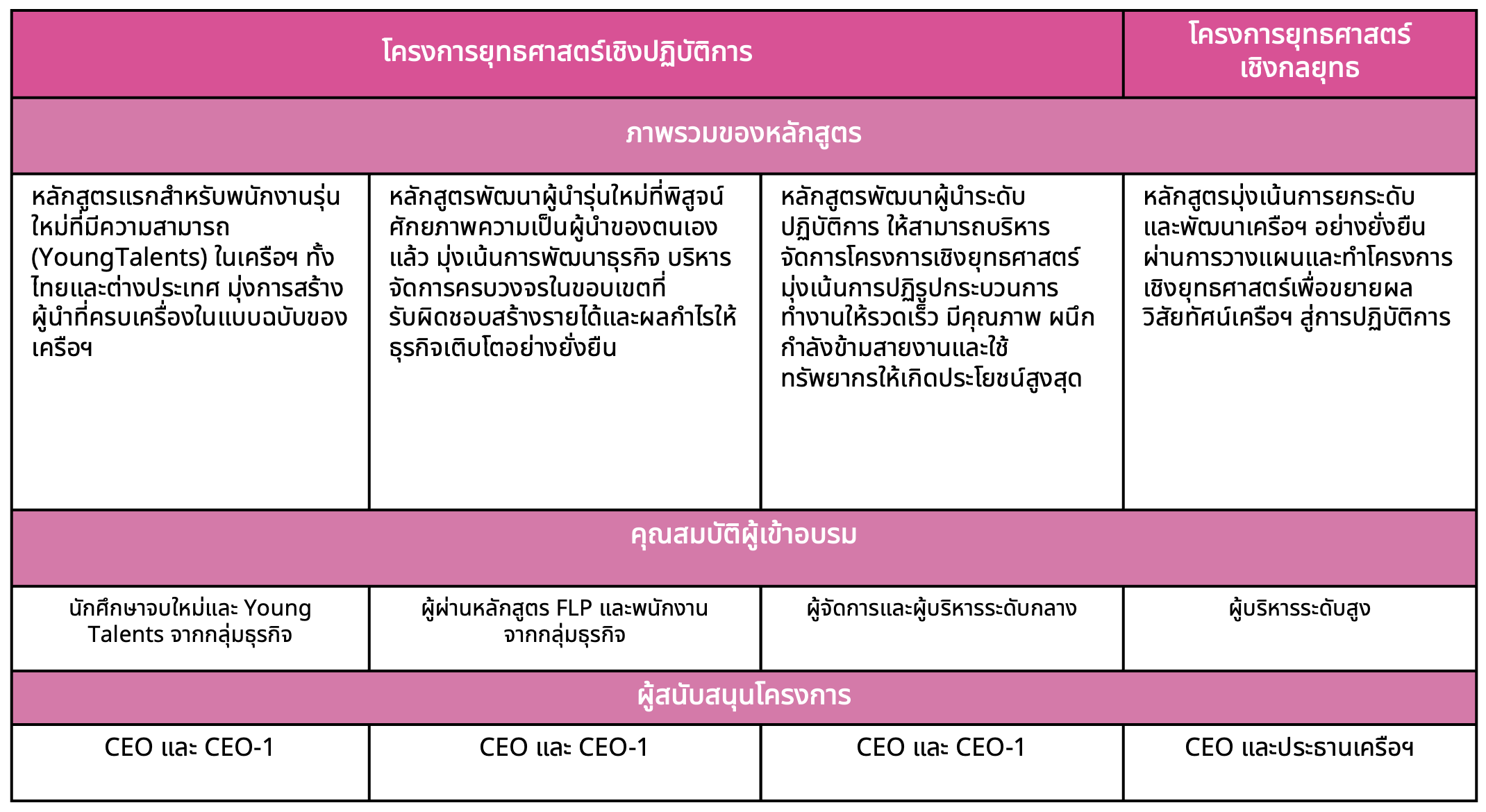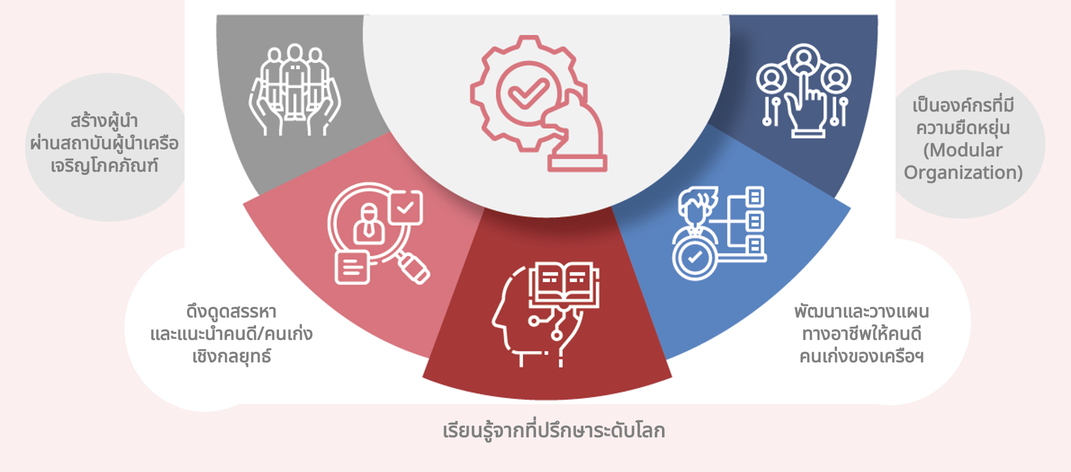 ในการนี้กลุ่มธุรกิจฯ ได้ดำเนินการตาม ‘กลยุทธ์ด้านทรัพยากรบุคคลของเครือฯ Workforce 4.0’ ขับเคลื่อนด้วย 6 ค่านิยมเครือฯ ข้อมูลดิจิทัล และเทคโนโลยี ประกอบด้วย 5 กลยุทธ์หลัก เน้นการสร้างผู้นำรุ่นใหม่ผ่านการเรียนรู้จริง โดยมีสถาบันผู้นำ เครือฯเป็นศูนย์กลาง สร้างระบบนิเวศการบริหารจัดการทรัพยากรบุคคล ซึ่งครอบคลุม การสรรหาคนดีคนเก่ง การเรียนรู้จากที่ปรึกษาระดับโลกในด้านต่างๆ การพัฒนาและวางแผนทางอาชีพคนดี คนเก่งของเครือฯ และปรับองค์กรให้เป็นองค์กรที่มีโครงสร้างแบบยืดหยุ่น ให้สอดรับกับความเปลี่ยนแปลงของธุรกิจและความเปลี่ยนแปลงที่เกิดขึ้นบนช่องว่างความแตกต่างทางยุคสมัยของคน
