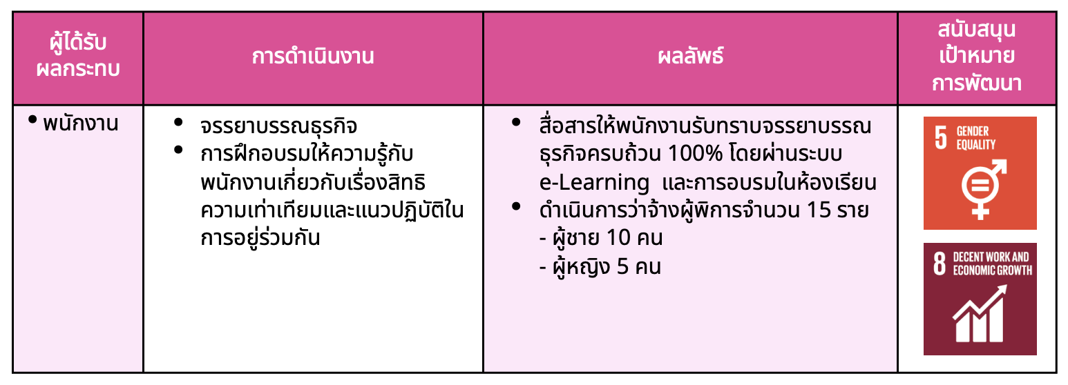 - มีช่องทางการสื่อสารที่เปิดให้พนักงานแสดงความคิดเห็นหรือร้องเรียนเมื่อถูกเลือกปฏิบัติ