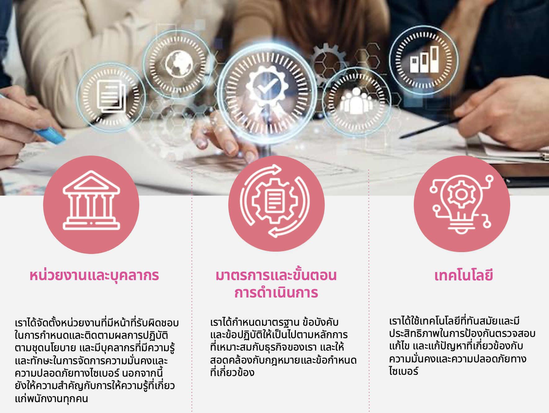 การดำเนินงานด้านความมั่นคงและความปลอดภัยทางไซเบอร์ เป็นสิ่งที่สำคัญสำหรับองค์กรใดๆ ไม่ว่าจะเป็นภาครัฐหรือเอกชน เพื่อป้องกันการสูญเสียข้อมูล การละเมิดความเป็นส่วนตัว หรือการถูกโจมตีจากผู้ไม่หวังดี บริษัทของเราได้มีแนวทางการบริหารจัดการในด้านนี้อย่างเป็นระบบ โดยพิจารณาจากลักษณะของธุรกิจและความต้องการของลูกค้า