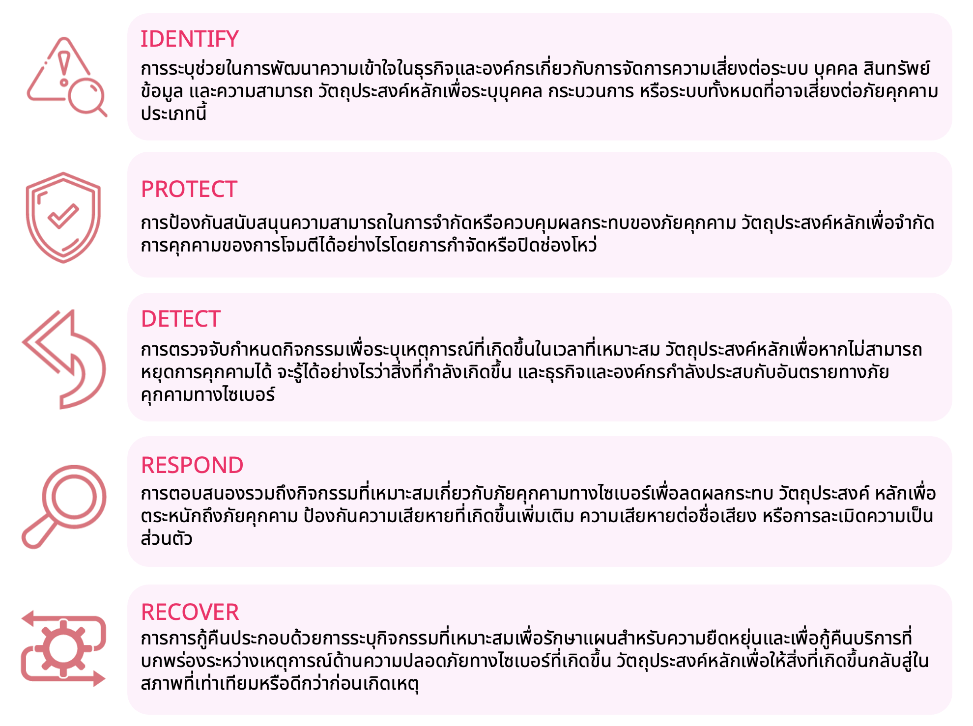 NIST Cyber Security Framework Functions ช่วยให้สามารถสร้างกลยุทธ์การป้องกันความเสี่ยงทางไซเบอร์ได้อย่างมีประสิทธิผล โดยแบ่งการดำเนินการออกเป็น 5 ขั้นตอน ได้แก่ Identify, Protect, Detect, Respond, Recover