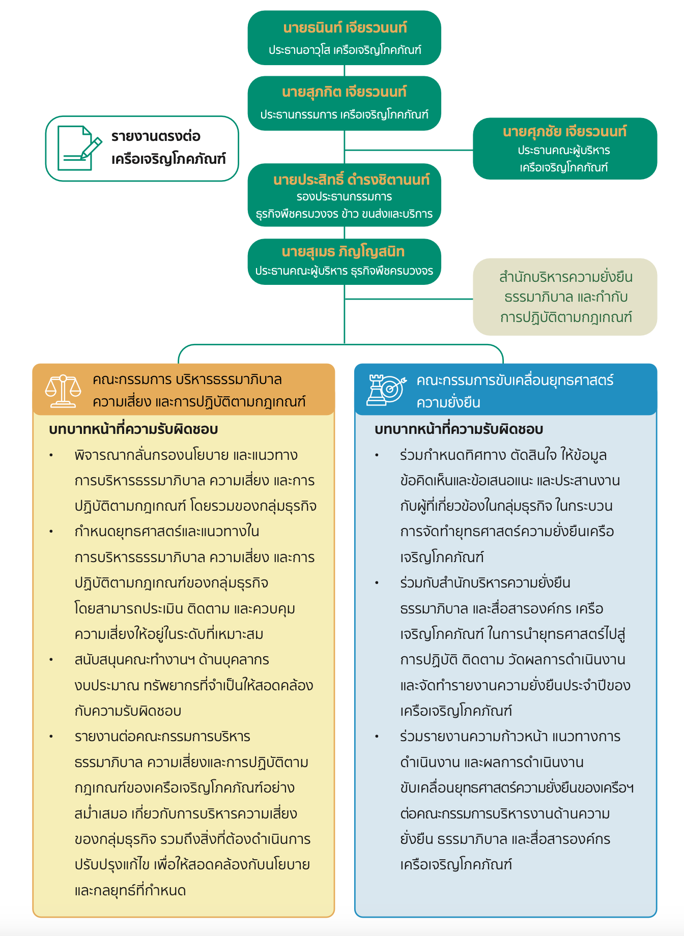 โดยจะครอบคลุมทั้งด้าน เศรษฐกิจ สังคม และ สิ่งแวดล้อม ทั้งนี้บริษัทได้บูรณาการแนวคิดเรื่องการพัฒนาอย่างยั่งยืนไปในโครงสร้างการบริหารการจัดการดังต่อไปนี้