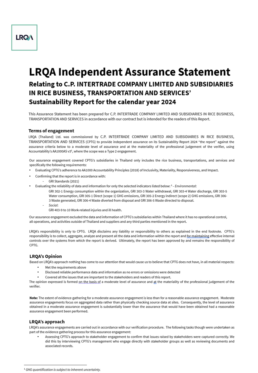 The policies and practices of the Charoen Pokphand Group’s International Trade and Integrated Plants (Corn) Business Group define the objectives, responsibilities, and methods of compliance with regulations and laws for directors and personnel, to be used in conjunction with the Business Ethics Code.