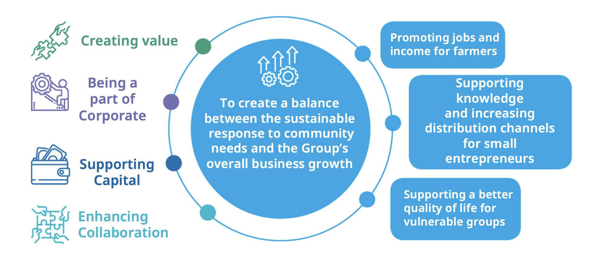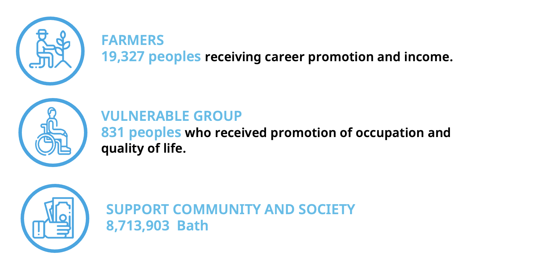 Therefore, we aim to promote activities that benefit vulnerable groups such as the disabled, the elderly, children, the socially disadvantaged, especially around the areas where the company operates. using knowledge and expertise in making a positive impact on society through a variety of support forms including: Supporting money, giving things, doing volunteer work, including transferring knowledge in various forms. especially about access to nutritious food and comprehensive education. To contribute to building a stable society and beneficial to the overall development of the country.