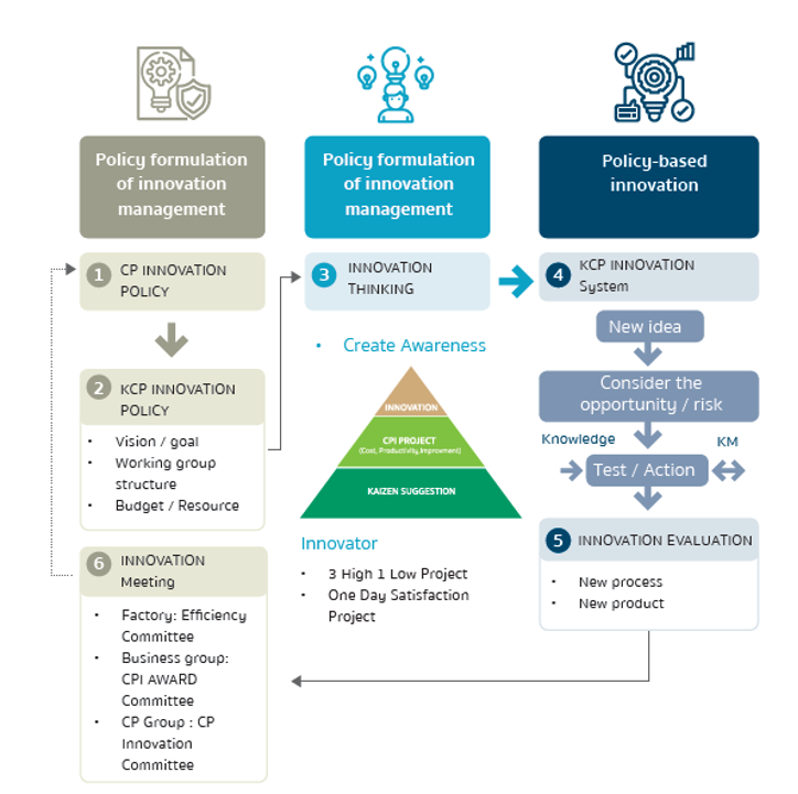 It is an important strategy and in line with the implementation of the values “innovate”, innovation will result in the organization’s leapfrog change, increase its competitiveness and create sustainable growth and able to deliver value to the stakeholders of the organization continuously. C.P. Intertrade Co., Ltd. and companies in the Rice Business Transportation and Service has set directions, objectives, goals and strategies to develop the organization to become an organization of Innovation consists of setting up, policy of innovation, creation of innovation, management of intellectual, as well as creating an innovative organization to drive systematically and continuously develop.