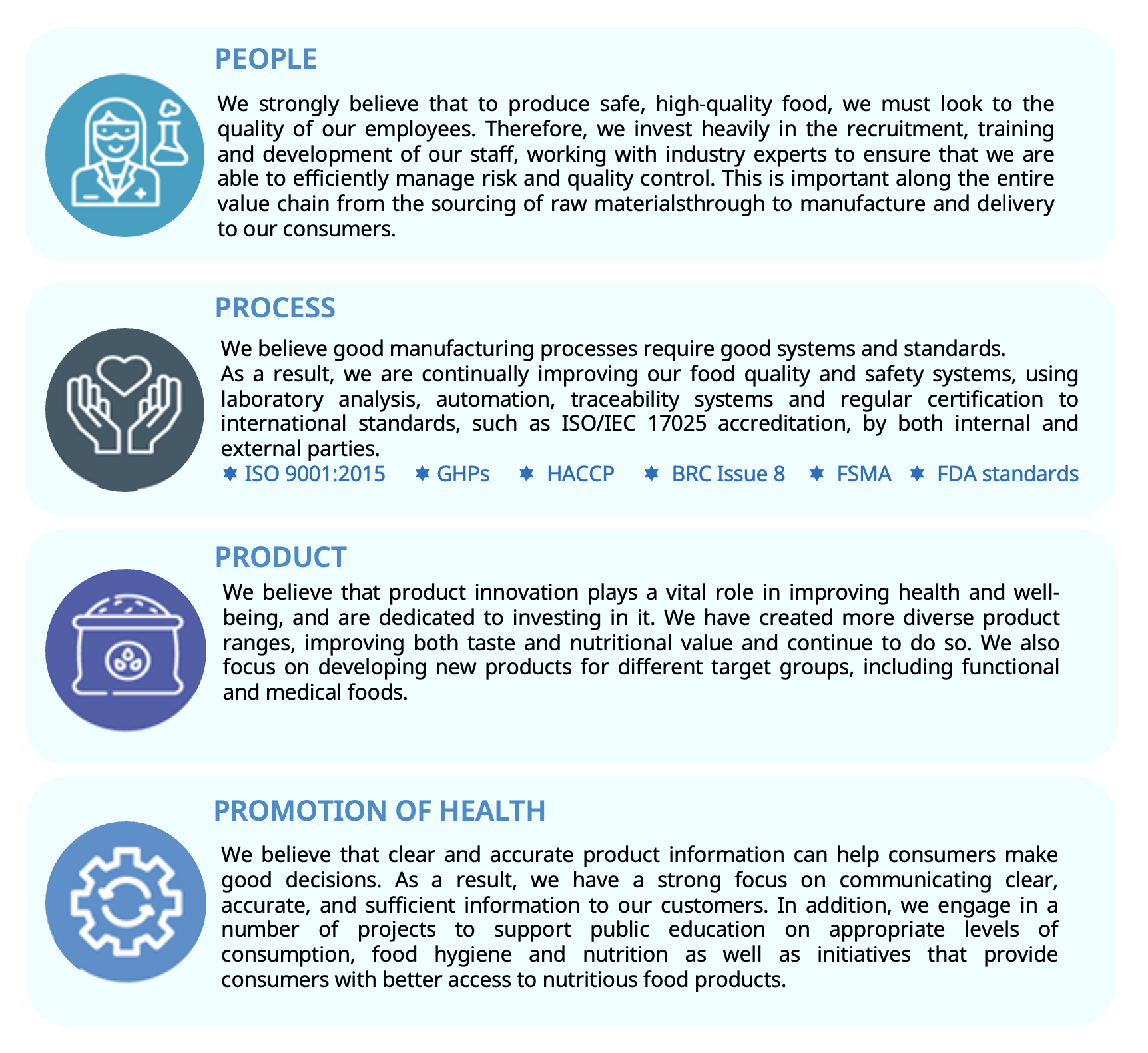 The Group is committed to investing in research and development, operating according to international standards, controlling and monitoring quality throughout the value chain, and promoting understanding of good nutrition for society. We focus on increasing the capacity of our employees (People), developing processes based on international standards (Process), offering products for promote good health and well-being (Product), and promote understanding of health issues (Promotion of Health) by providing product information and initiatives.
