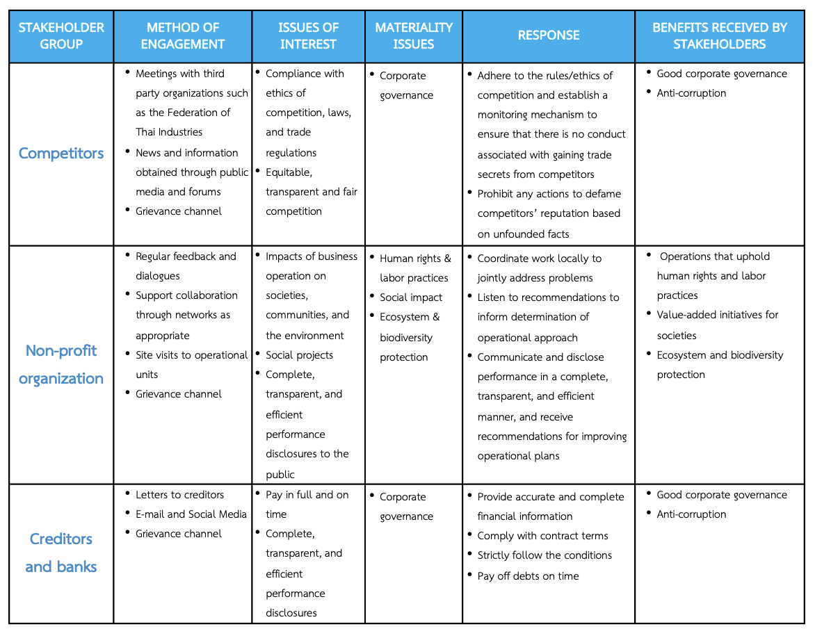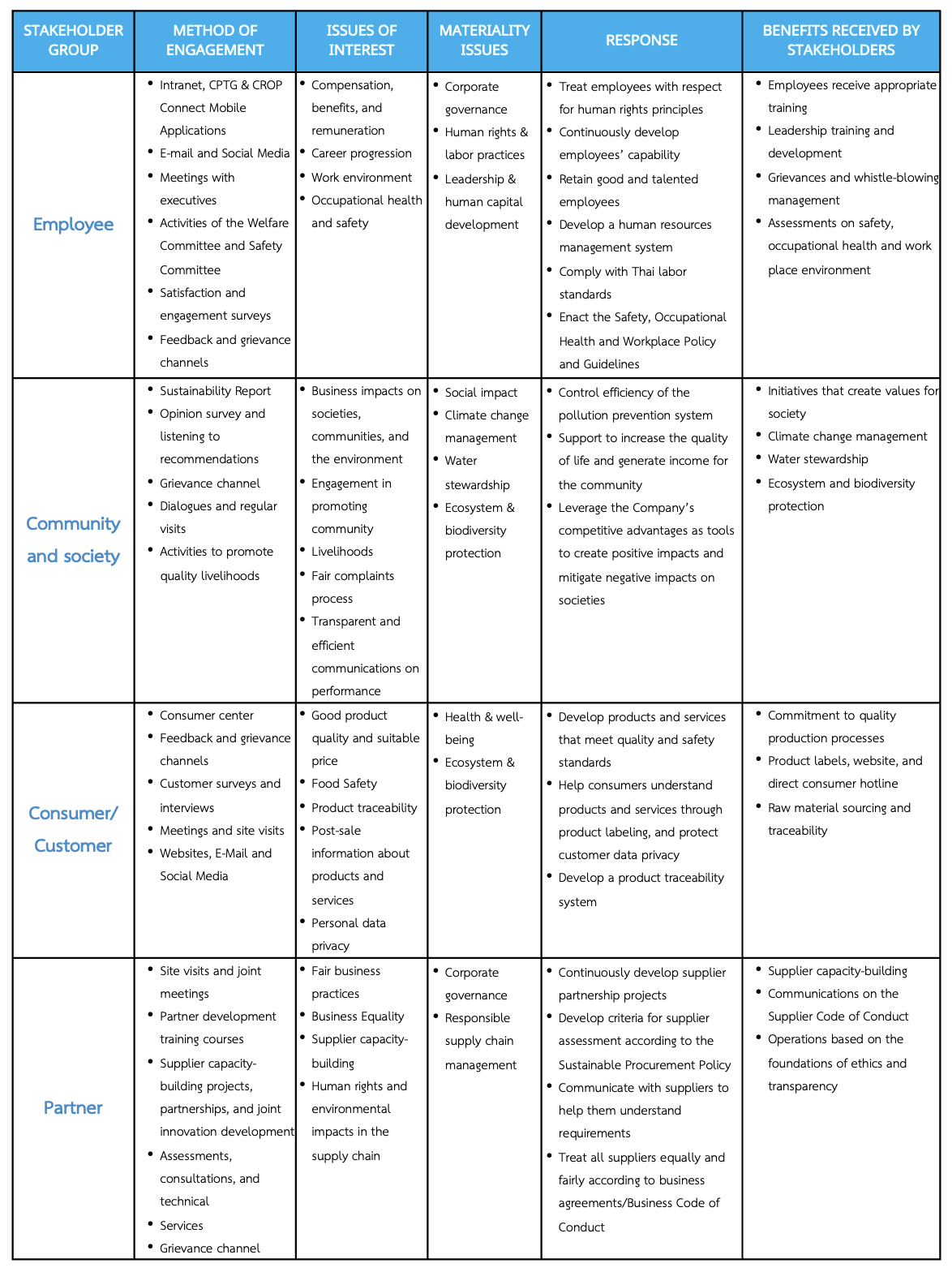 Comprehensive stakeholder engagement is at the heart and is incorporated into the strategic development of all companies in C.P. Intertrade Co., Ltd. and companies in the Rice Business Transportation and Service to balance corporate operations and stakeholder expectations. Stakeholders. As well as building good relationships with stakeholders by considering the needs of the stakeholders to respond in a manageable way that is important to both the business and the stakeholders.