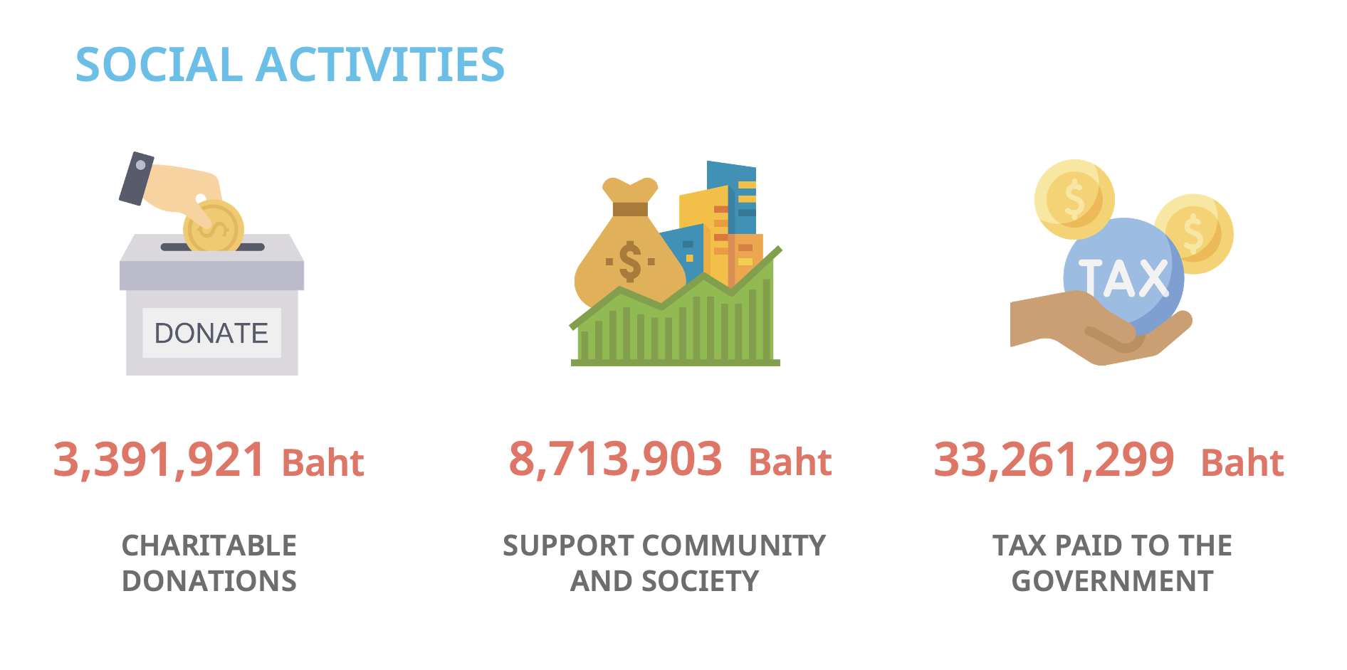 The company believes that the business can grow sustainably. Community and society must develop at the same time, so we recognize the importance of supporting social and community activities. and with awareness of the roles and duties of a good citizen and the philosophy of 3 benefits to the sustainability of the company (to the country, the people and the company).