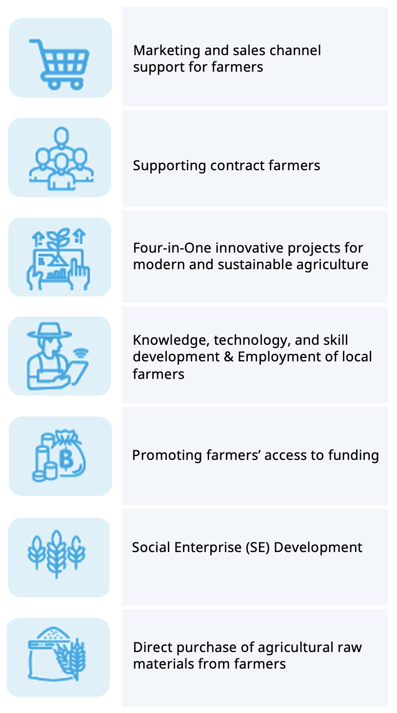 The agricultural sector is still an integral part of the economies of Thailand and many other countries around the world, as it is relevant to the livelihood of many people. Yet, most farmers are still in poverty due to the lack of capital, knowledge, technology, and access to markets. Meanwhile, C.P. Intertrade has the resources and can collaborate with relevant parties in order to improve the farmers’ quality of life, especially to eradicate poverty as part of addressing Goal 1 of the SDGs.