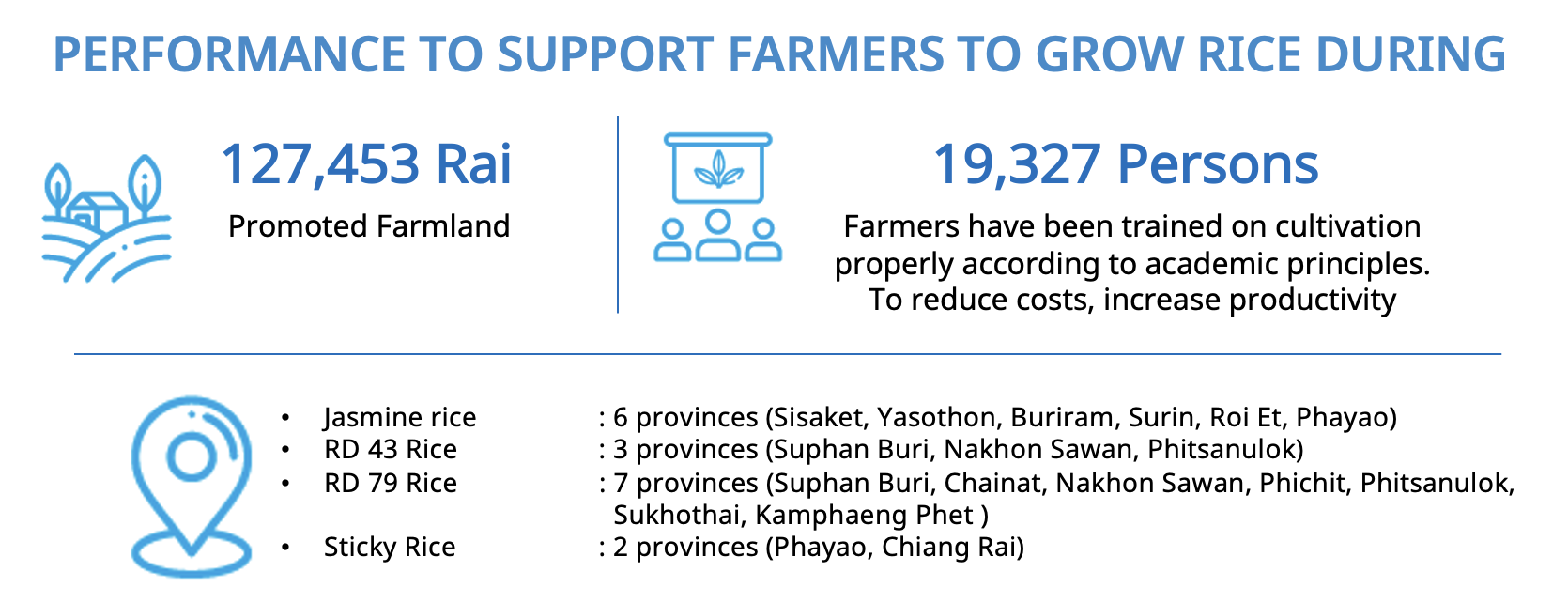Distribution channels 7-Eleven, Lotus, Makro bring the potential of their affiliated businesses Produce and distribute Thai farmer rice, size 5 kilograms, price only 189 baht. Which will start selling from January 18th onwards. We would like to invite consumers. Come try the new jasmine rice at the beginning of the season, sourced directly from farmers. Harvest every smile Every word has meaning, creating smiles, happiness and pride for Thai farmers.