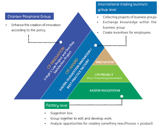C.P. Intertrade Co., Ltd. and companies in the Rice Business Transportation and Service community recognizes the importance of cultivating and creating a positive attitude towards creation, innovation and development create innovation covering 3 areas: economy, technology and society. The company started by focusing on the operations of the operational staff. By focusing on employees to solve problems on-site by themselves, a feedback system (Kaizen Suggestion), and it provides incentives by creating a platform for employees to present their management as they develop and develop into a certain culture. Next, there is a goal for employees to work together, so there is a teamwork set. Using the concept of QCC System allows employees to group together. Solving tougher problems, decisions are made between teams to achieve joint resolution through the CPI Project process, covering optimization, cost reduction and continuous improvement. Then focus on cooperation as “Cross Function” develop into the Innovation System process sent to “CP INNOVATION” of the group. Employees show their potential in the CPI Award performance contest with the aim of recognizing innovators who invented their work and to share. Employees’ knowledge and experience exchange, and works will be developed and upgraded to the Group’s innovation competition.