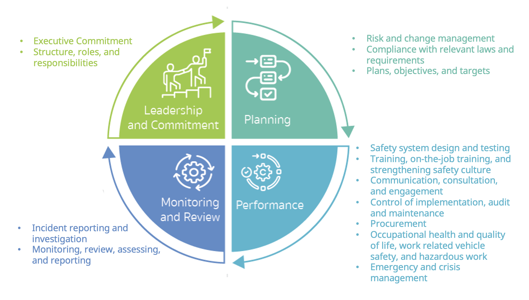 5. Follow up, review and evaluate the implementation of the safety, occupational health and work environment policies and plans, continually improving and sustainable development.