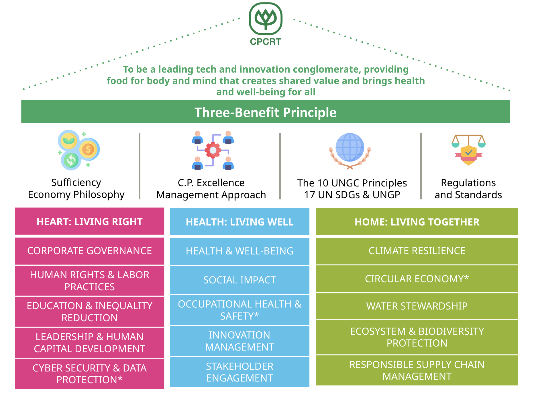 In 2016, C.P. Group and C.P. Intertrade Co., Ltd., the International Trading Business Group developed the Sustainability Strategy and the 2020 Goals under the 3Hs Framework, which includes HEART – Commitment to Sustainable Business, HEALTH – Commitment to SustainableSociety, and HOME – Commitment to Sustainable Environment. The Sustainability Strategy is based on the 4 elements which are reflected from the “Three-Benefit Principle,” the core of our businesses and our sustainability foundation. The Principle aims to create benefits toward the country, the people, and the company. The first element is Sufficiency Economy which can be integrated into our whole supply chain. It emphasizes that businesses must acknowledge and understand their own competency, and operate adequately and sufficiently. The second element is the C.P. Excellence Management Approach which aims at transitioning the organization through internal synergy between business, people, and mind. The third element refers to international guidelines related to sustainable business operations, including UN Global Compact, UN Guiding Principles on Business and Human Rights (UNGP), and UN Sustainable Development Goals (SDGs). C.P Group is committed to operating in accordance with such international guidelines, and supporting all of the 17 SDGs. The last element is rules and regulations, and standards of the countries in which we operate. Strict compliance with such rules and regulations, and standards are fundamental to our businesses.